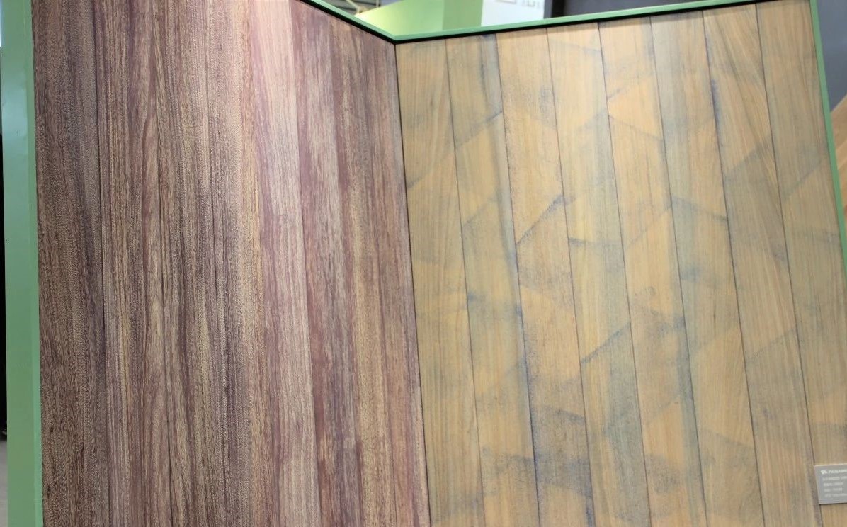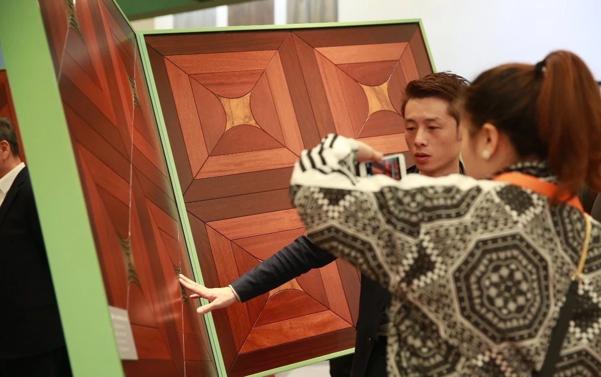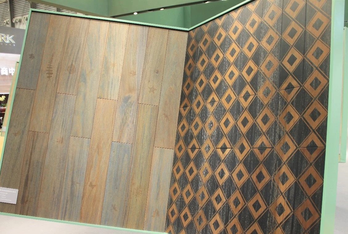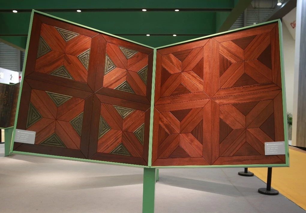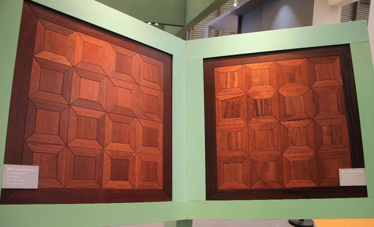 完美融合了高雅設(shè)計(jì)理念及實(shí)用功能的現(xiàn)代空間里,有著上海地材展上吸睛無(wú)數(shù)的泛美地板系列拼花產(chǎn)品:尼德蘭、木玉石、田子坊和十字符拼花。這些地板工藝復(fù)雜,是集合珍木材質(zhì)、適地暖功能,與現(xiàn)代美學(xué)設(shè)計(jì)裝飾需求共同平衡的結(jié)果,簡(jiǎn)潔流暢的線條,極具質(zhì)感的南美硬木紋理,隱蔽縫粘扣帶鋪裝技術(shù)的加持,在豐富多樣的珍木材種選擇中,完美實(shí)現(xiàn)客戶的獨(dú)家高級(jí)定制。
