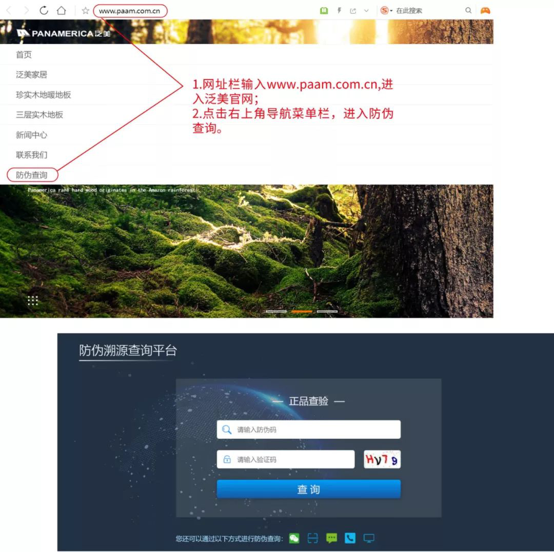 打開手機(jī)或電腦瀏覽器,網(wǎng)址欄輸入:paam.com.cn,進(jìn)入泛美地板官網(wǎng);點(diǎn)擊官網(wǎng)界面右上方導(dǎo)航菜單欄,點(diǎn)擊防偽查詢子欄目,進(jìn)入防偽溯源查詢平臺(tái)界面,輸入防偽標(biāo)簽里層二維碼底部16位防偽碼數(shù)字與提示驗(yàn)證碼,即可驗(yàn)證真?zhèn)巍?/span>